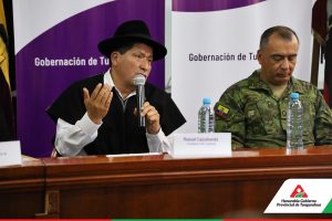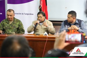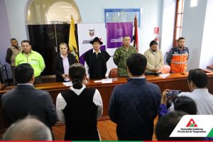 El Prefecto Manuel Caizabanda, Presidente del COE Provincial, junto a la Gobernadora de la Provincia, Liliana Travéz, y los alcaldes de Pelileo y Tisaleo, se reunieron con representantes del Ejército, Policía Subzona Tungurahua, Ministerios de Salud y Educación Zonal 3, y el Ministerio de Obras Públicas. La reunión, por la emergencia provocada por las fuertes lluvias que provocaron deslaves el pasado domingo 16 de junio en el sector Río Verde del cantón Baños de Agua Santa, afectó a decenas de familias y cerró la Red Vial Estatal (RVE) Baños-Puyo por seguridad.