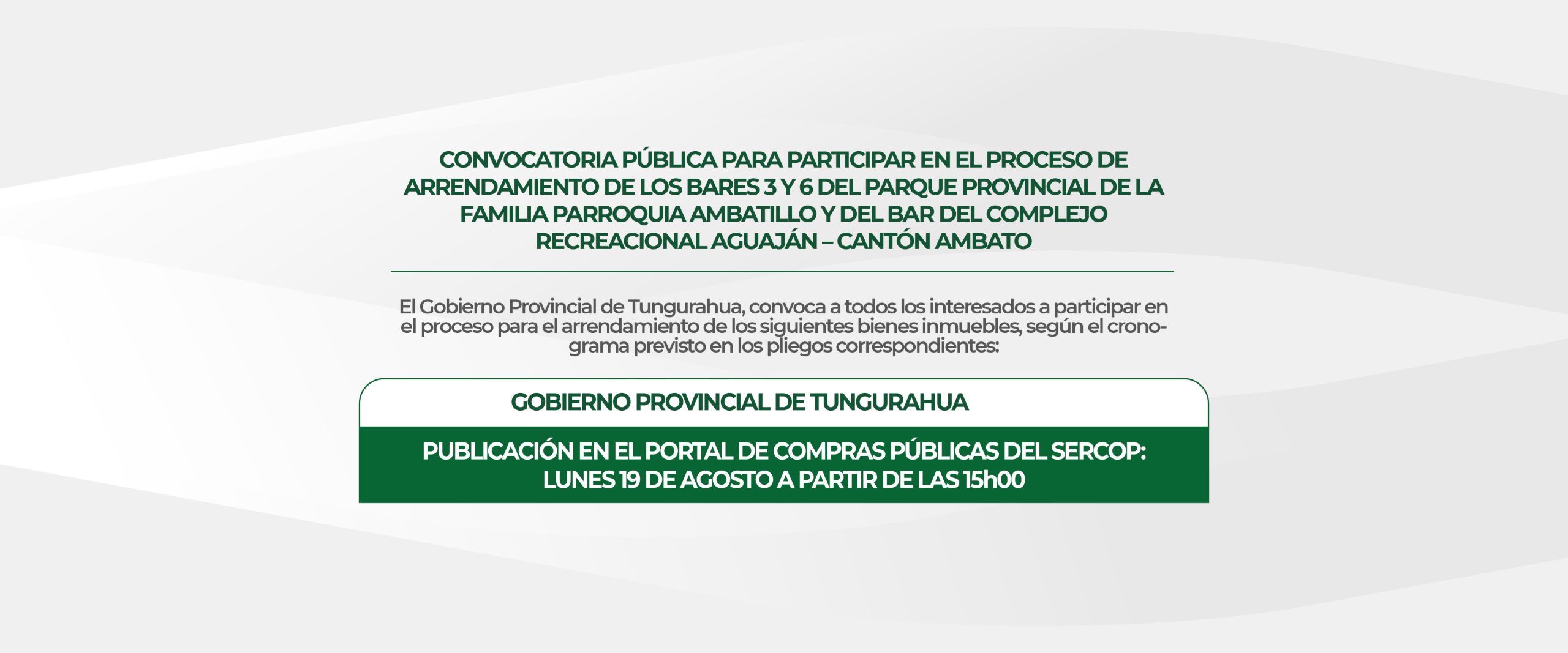 𝗖𝗼𝗻𝘃𝗼𝗰𝗮𝘁𝗼𝗿𝗶𝗮 𝗣ú𝗯𝗹𝗶𝗰𝗮: 𝗔𝗿𝗿𝗲𝗻𝗱𝗮𝗺𝗶𝗲𝗻𝘁𝗼 𝗱𝗲 𝗕𝗮𝗿𝗲𝘀 𝗲𝗻 𝗲𝗹 𝗣𝗮𝗿𝗾𝘂𝗲 𝗣𝗿𝗼𝘃𝗶𝗻𝗰𝗶𝗮𝗹 𝗱𝗲 𝗹𝗮 𝗙𝗮𝗺𝗶𝗹𝗶𝗮 ¡Atención, emprendedores del sector gastronómico! El Parque Provincial de la Familia, en la parroquia Ambatillo, cantón Ambato, abre sus puertas a nuevas oportunidades.Invitamos a participar en el proceso de arrendamiento de los Bares 3 y 6, ubicados en uno de los destinos turísticos […]