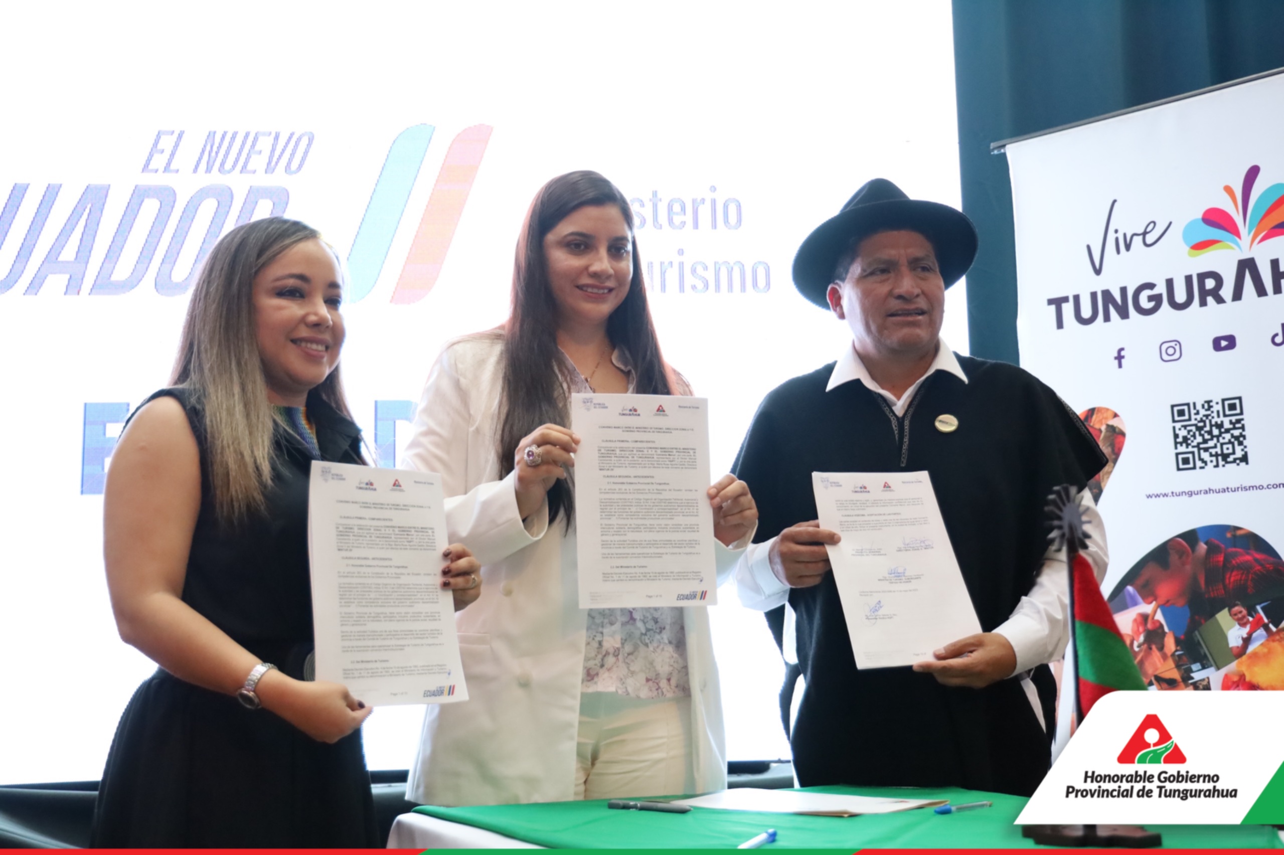 En el marco de la IV Edición del Foro Nacional de Turismo (FONATUR) 2024, el Gobierno Provincial de Tungurahua, representado por el Prefecto Manuel Caizabanda, y el Ministerio de Turismo, representado por María Rosa Aguirre Cedillo, Directora Zonal 6 del Ministerio de Turismo (MINTUR Z6), suscribieron un convenio marco para ejecutar acciones de cooperación mutua a favor de la actividad turística en la provincia de Tungurahua. La Ministra de Turismo Subrogante, Silvana Ramírez, actuó como testigo de honor.