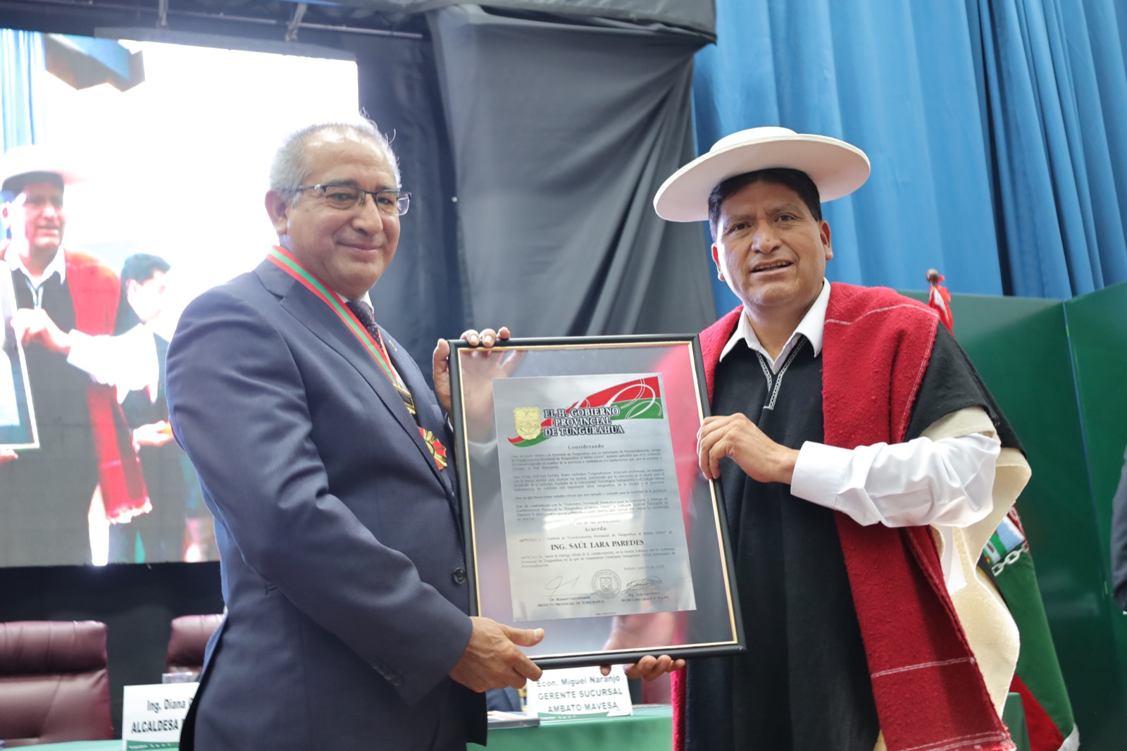 La Condecoración al Mérito Cívico de Tungurahua se entregó a: Grupo Mavesa por constituirse en empresa líder del mercado automotor; Saúl Lara, canciller de la Universidad Tecnológica Indoamérica gestor para la creación de este centro de estudios y, a Rosario Fiallos por su vida artística.